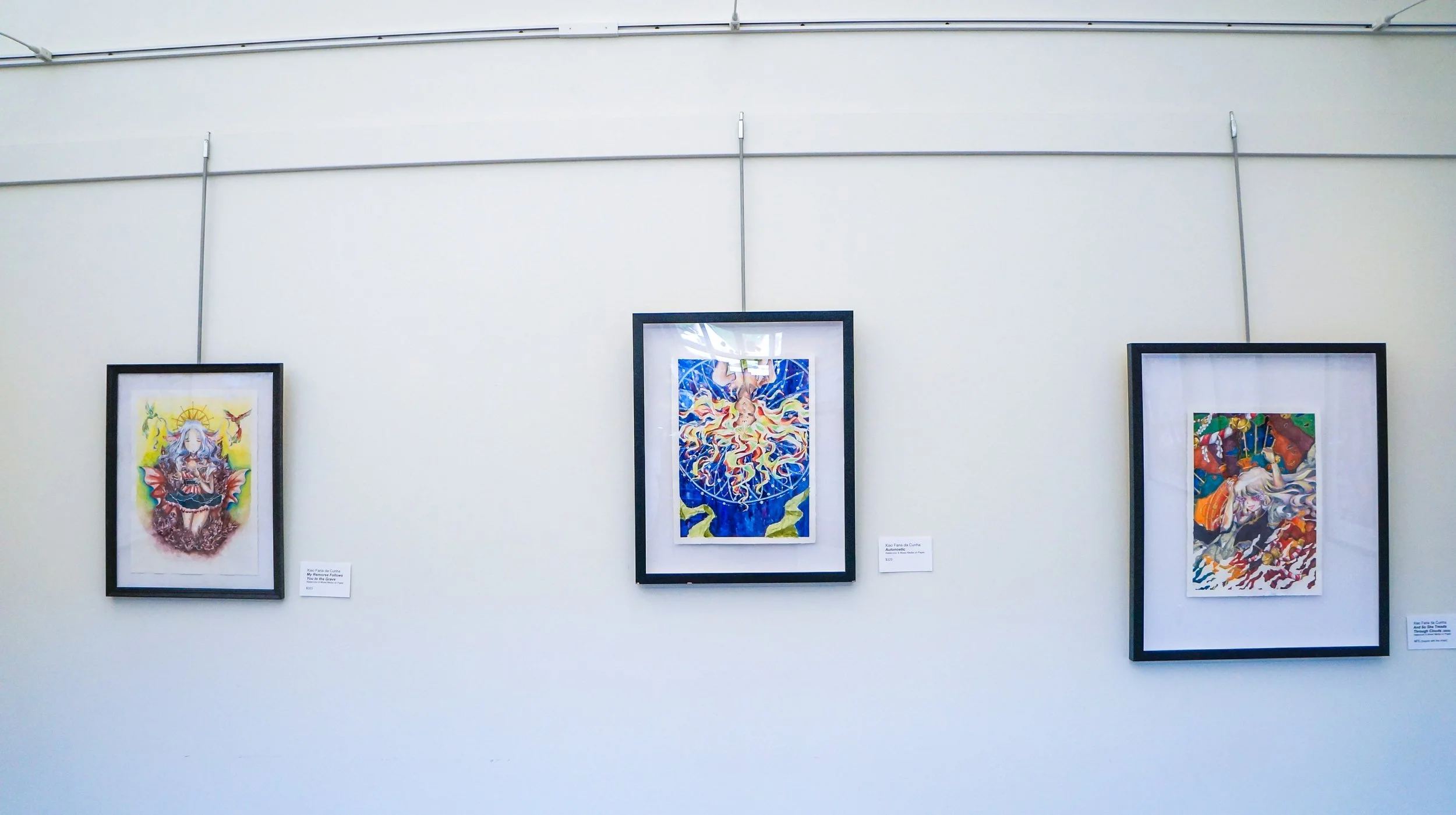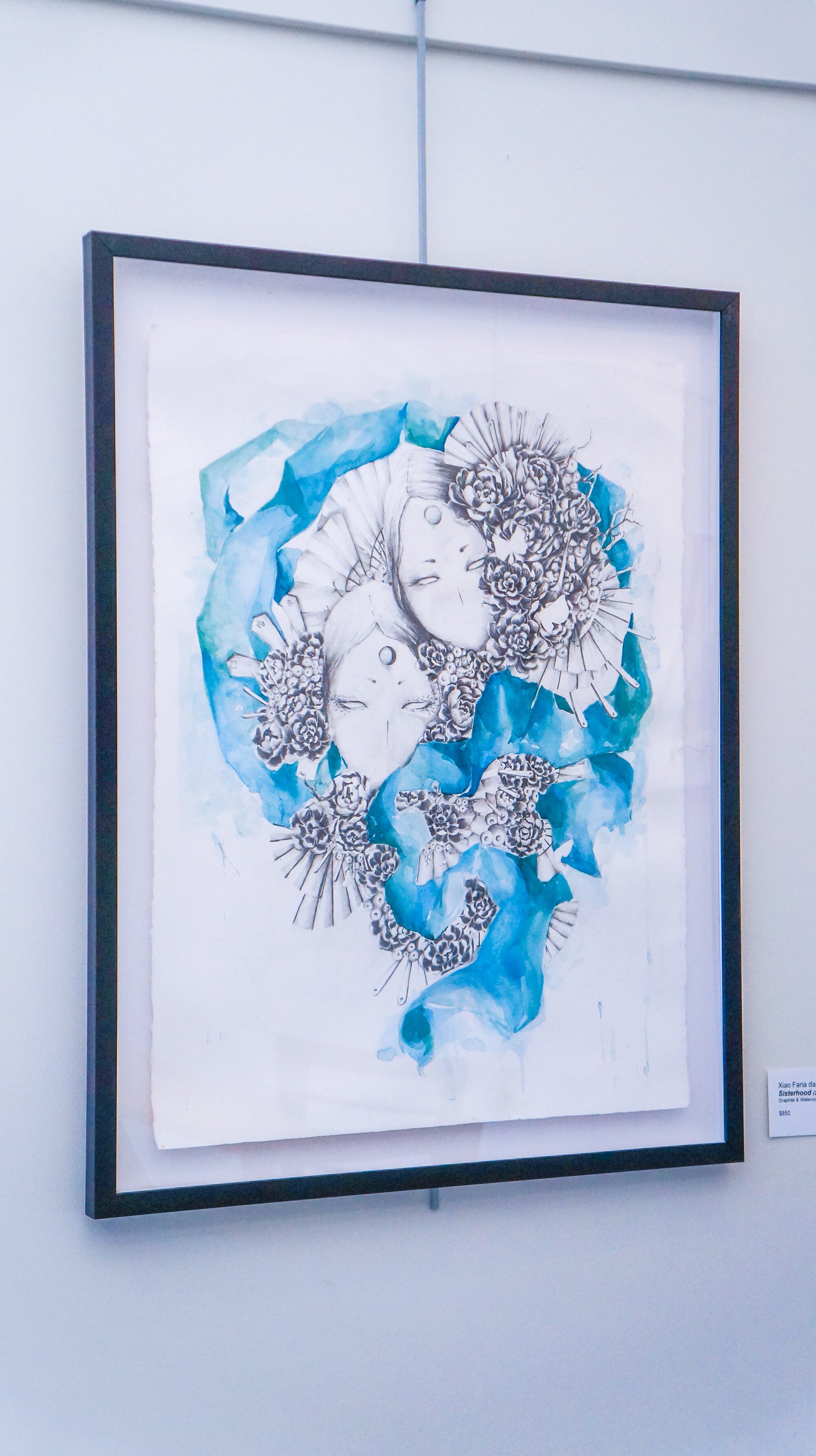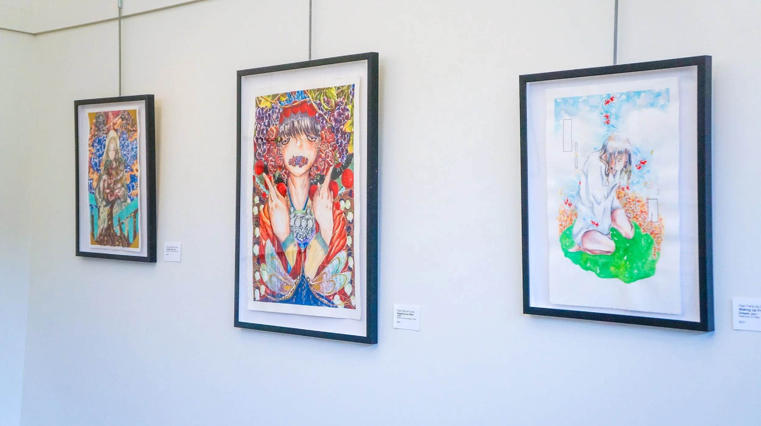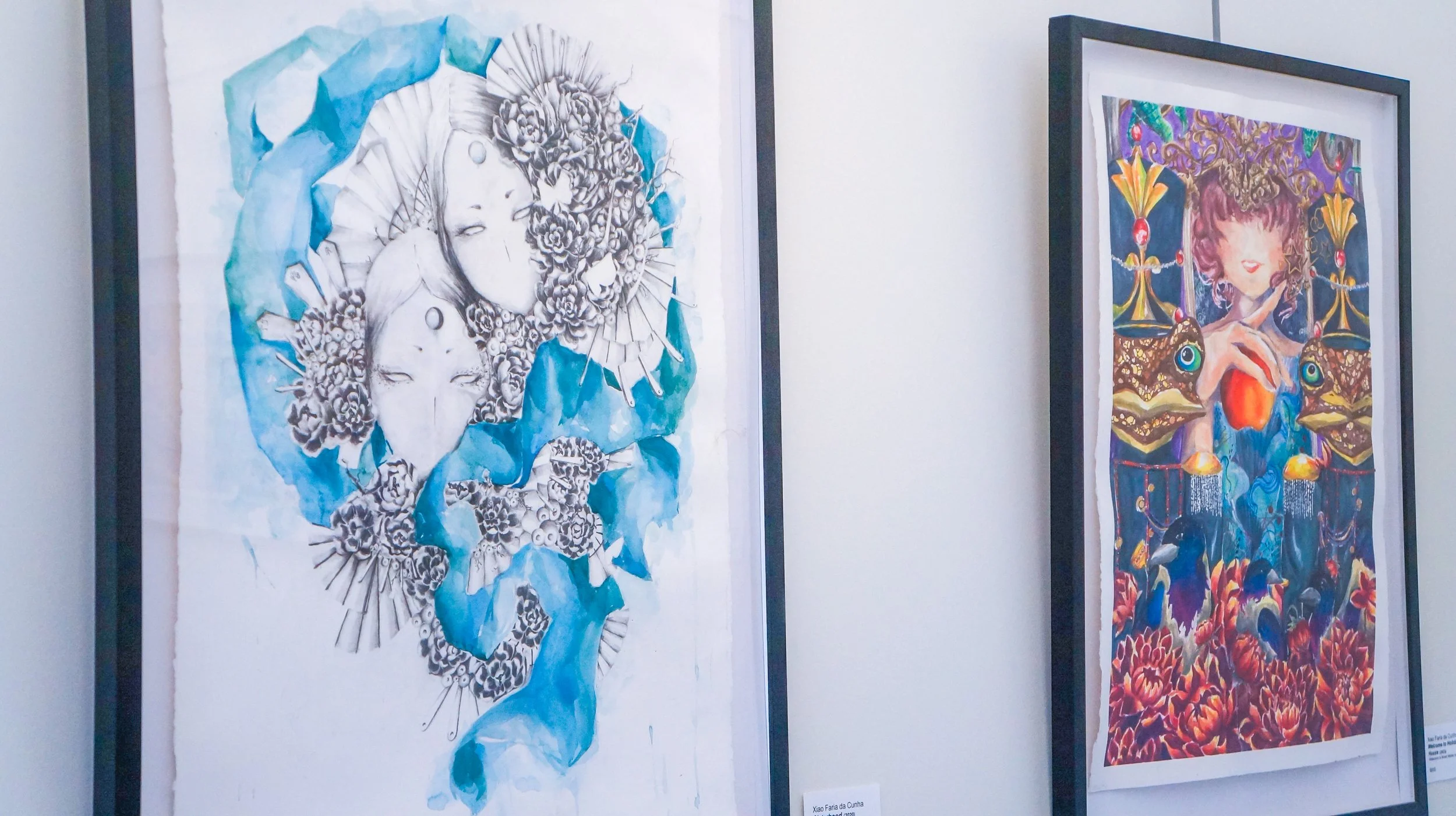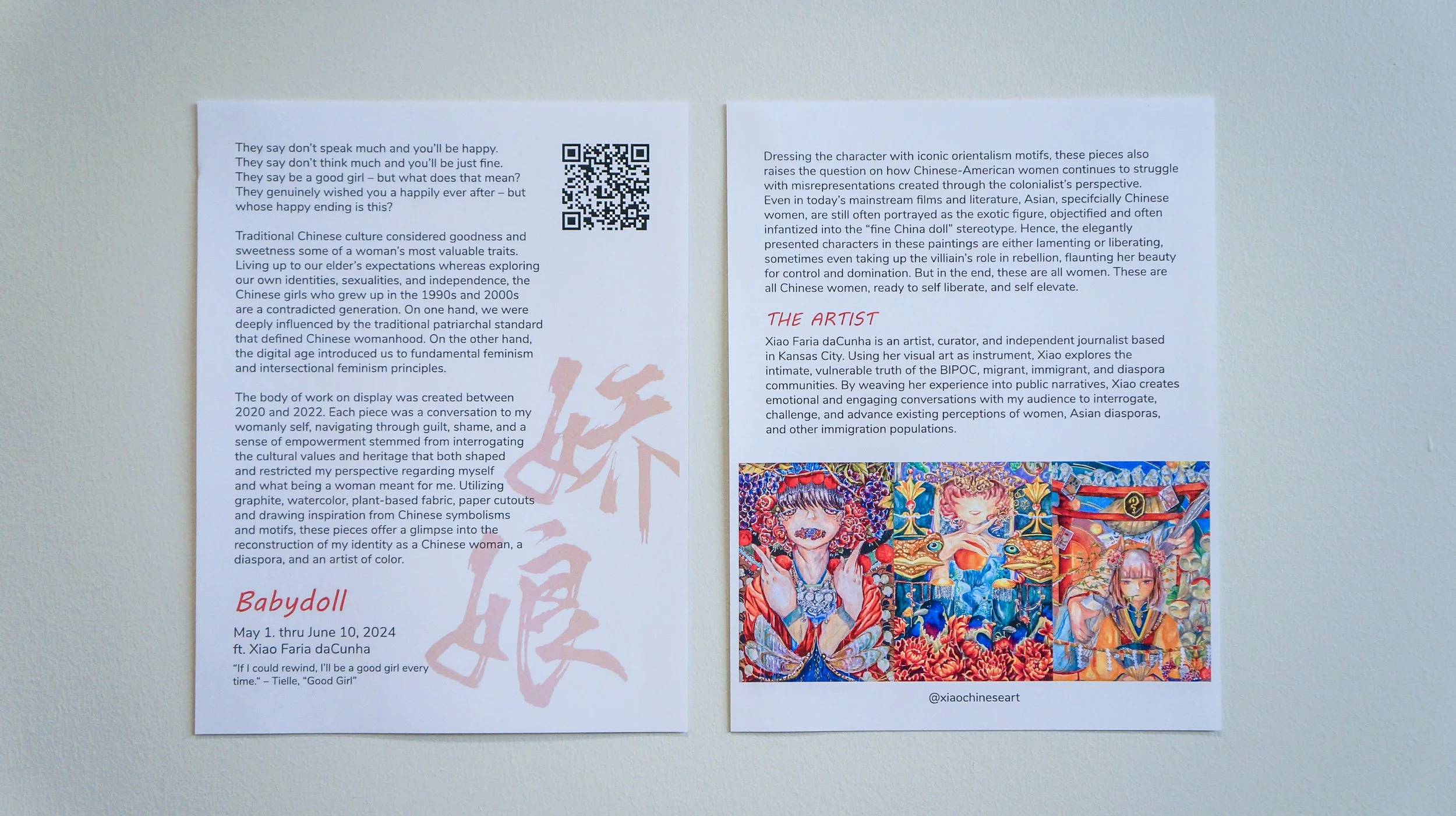 The body of work on display was created between 2020 and 2022. Each piece was a conversation with my womanly self, navigating through guilt, shame, and a sense of empowerment stemmed from interrogating the cultural values and heritage that both shaped and restricted my perspective regarding myself and what being a woman meant for me. Utilizing graphite, watercolor, plant-based fabric, paper cutouts, and drawing inspiration from Chinese symbolism and motifs, these pieces offer a glimpse into the reconstruction of my identity as a Chinese woman, a diaspora, and an artist of color.